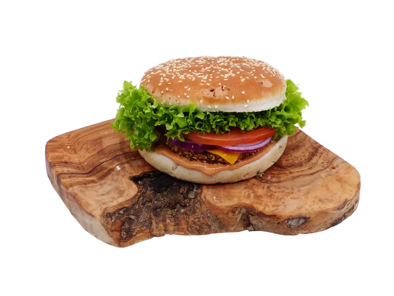 Gemüseburger, Tomate, Zwiebel, Salat, veganer Schmelzkäse, vegane Majo-Ketchup-Sauce
